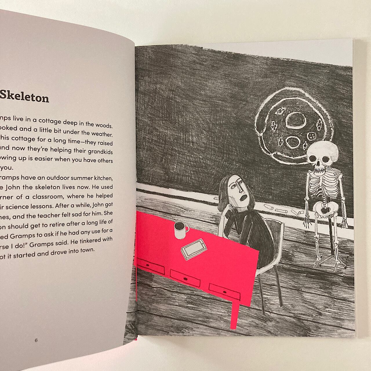 When John is adopted by Grams and Gramps and leaves the classroom to live on their farm, every day is an exciting new adventure: John rides in the car for the first time, makes a snow angel, scares away crooks, and becomes a source of comfort for Grams, Gramps, and their grandkids. With delightful illustrations and a charming cast of characters, John the Skeleton is a quirky, touching, and unforgettable book. Triinu Laan thoughtfully weaves aging and death into the fabric of life, crafting a tender portrait of what it means to care for one another, grow old together, and appreciate the little things.