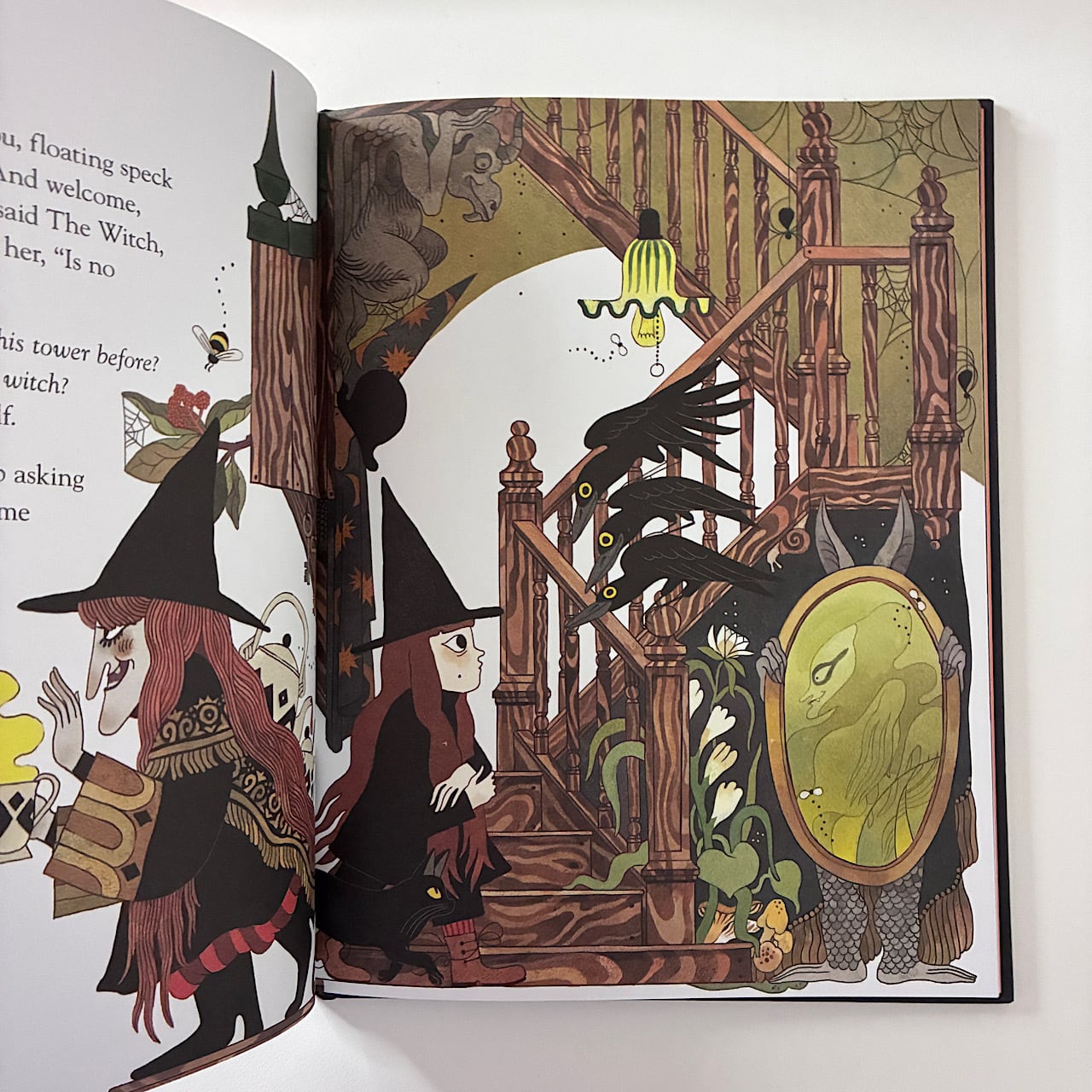 Meet The Witch... The Witch welcomes Carmela into a magical world far beyond the limits of her imagination - a place filled with cauldrons, spells, potions, flying toads and frogs. Carmela visits libraries teeming with ancient books; rooms where worms and spiders weave intricate dresses; a spectacular dome of crystal prisms and, finally, at the very top of the tower - Carmela gets her very own broomstick.