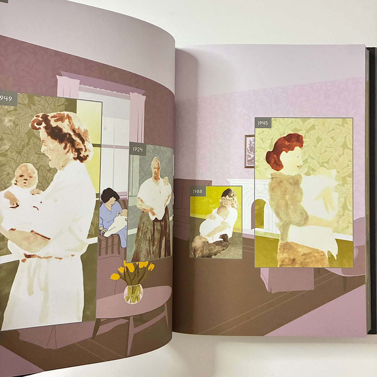 同じアングルで描かれたリビングルームには大小様々な「窓」が重ねられ、そこには過去・未来などさまざまな光景が描き出されていきます。その時間は遥か昔から遥か未来まで、長い長い時が描かれます。