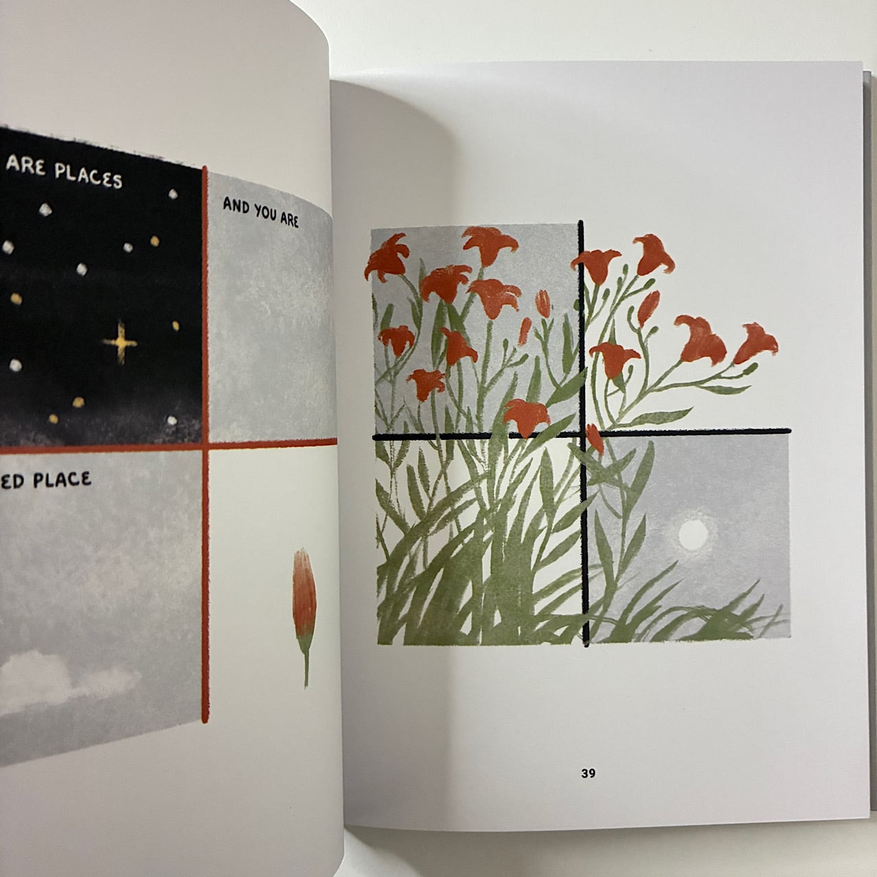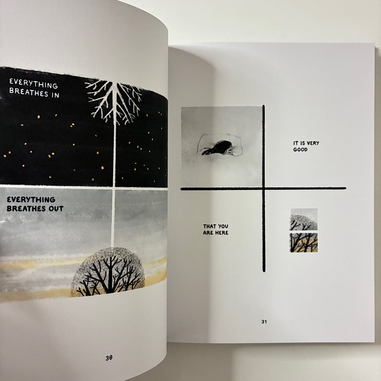 各ページには4つに分けられた小さなイラストと、詩的な言葉が綴られ、静かなメッセージを描いていきます。