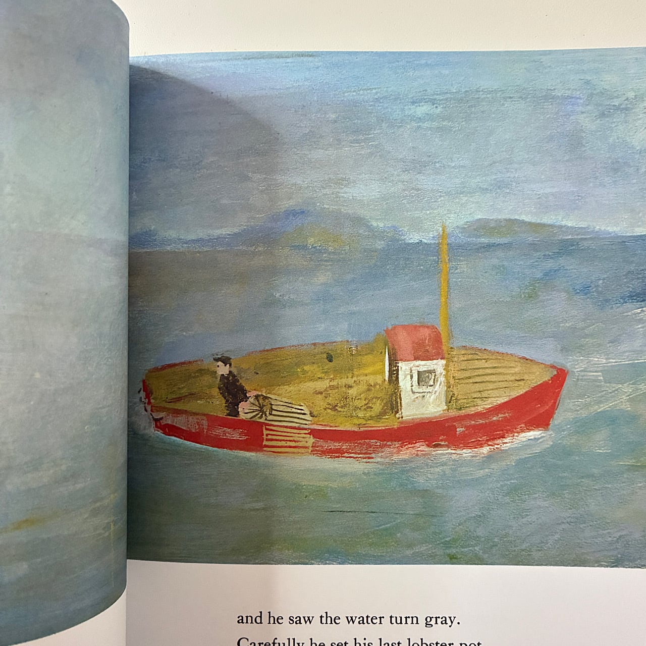 彼は霧が波の上の太陽の輝きを消し去るのを見ました。そして水が灰色に変わるのが見えました。彼は最後のロブスター籠を慎重にセットし、ボートを岸に戻しました。