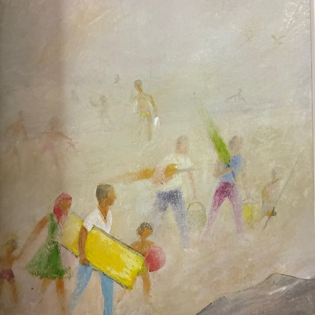 一方、子どもたちはこの神秘的な霧を楽しみ、かくれんぼをしたりして遊びます。霧の湿気や寒さ、ぼんやりとした雰囲気。霧が日常を不思議なものに変える様子がデユボアザンの水彩画で描かれていきます。
