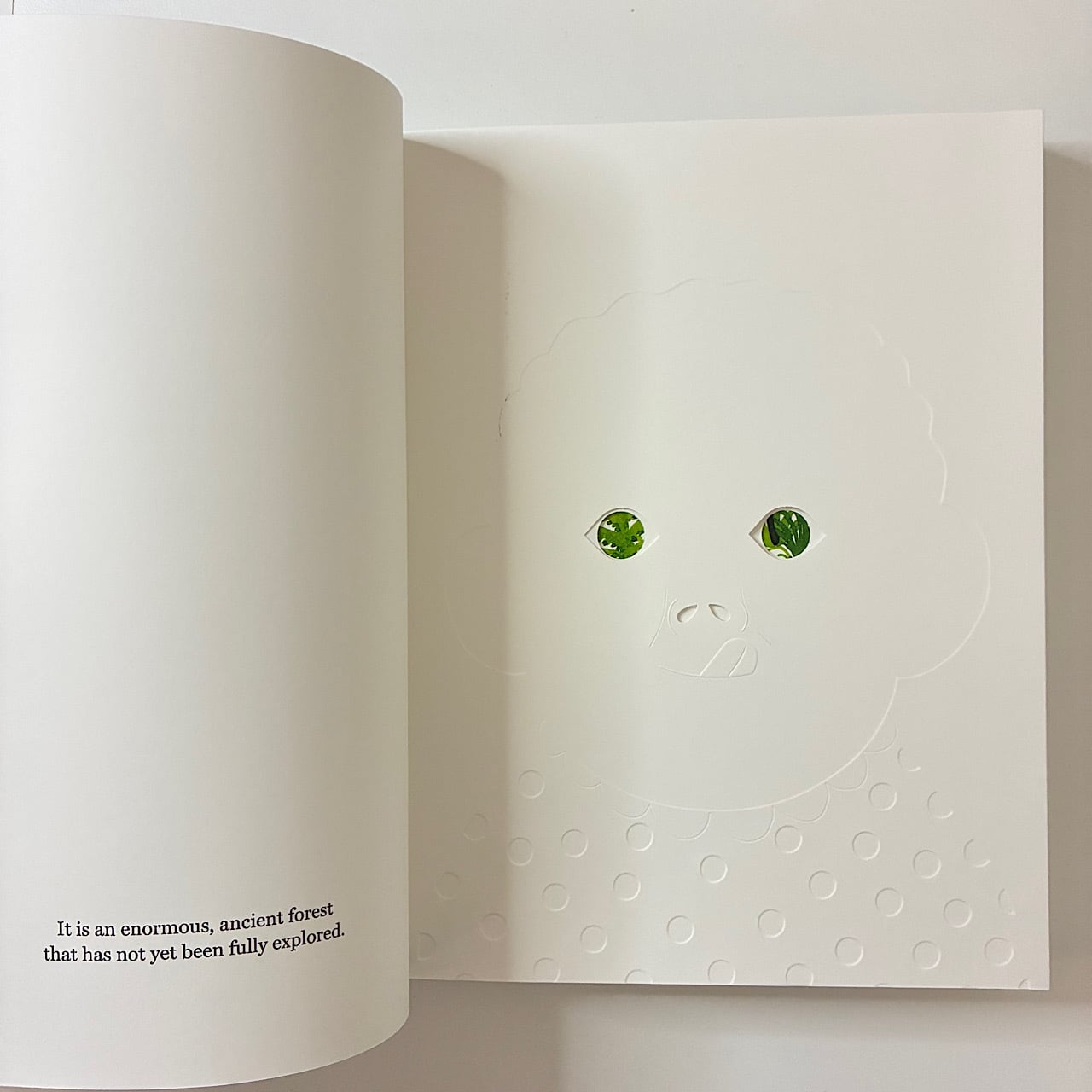 ページに穴や切り抜きがあり、森の葉や枝を通じて人間の姿が覗くように設計されています。人間が自然の一部として謙虚に存在し、征服者ではなく一時的な訪問者であることを象徴する型抜き。白いページに人間のシルエットが浮き彫りで表現され、年齢の進行を触覚的に感じさせる浮き出し加工など、これらの仕掛けは、単なる装飾ではなく、作品の核心を成しています。