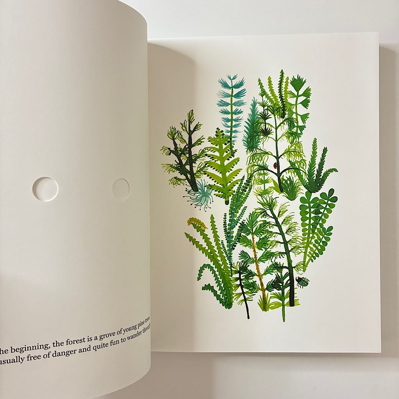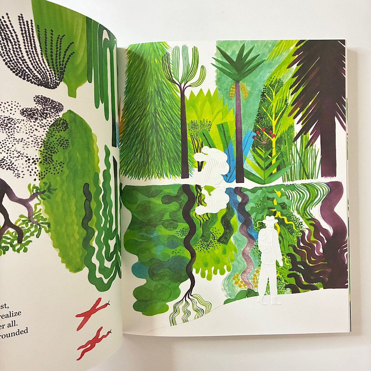 A lyrical book about the adventure of life, The Forest is also a magnificent visual work, both painterly and a technical feat of paper engineering. Here, sensory experience and the textures of the material world are rendered through die-cuts, embossing, cutouts, and a single gatefold. A beautifully considered work.