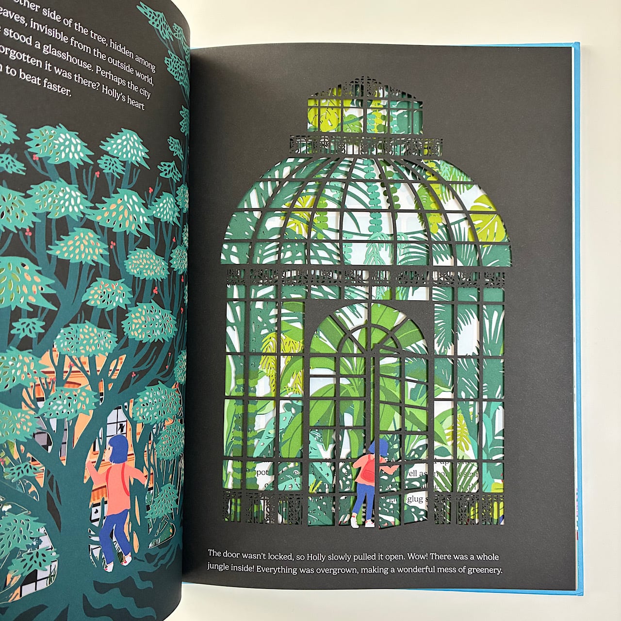 レーザーカット技法で多層の紙を重ねた繊細な切り絵が、光を通すことで蔦や葉が浮かび上がり、ページをめくるたびに立体的な温室が現れていきます。光と影の効果がとても美しい絵本です。