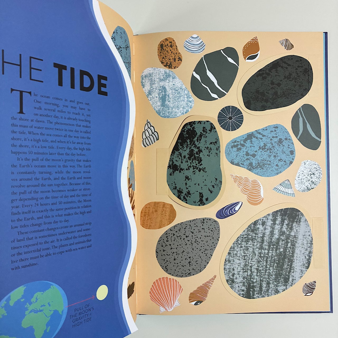 波や潮の動き、水の循環から始まり、海の生き物たちの生態(貝やカニが岩の下に隠れている様子、ダイオウイカの巨大さ、珊瑚礁の劇場のような舞台など)を詳細に紹介します。
