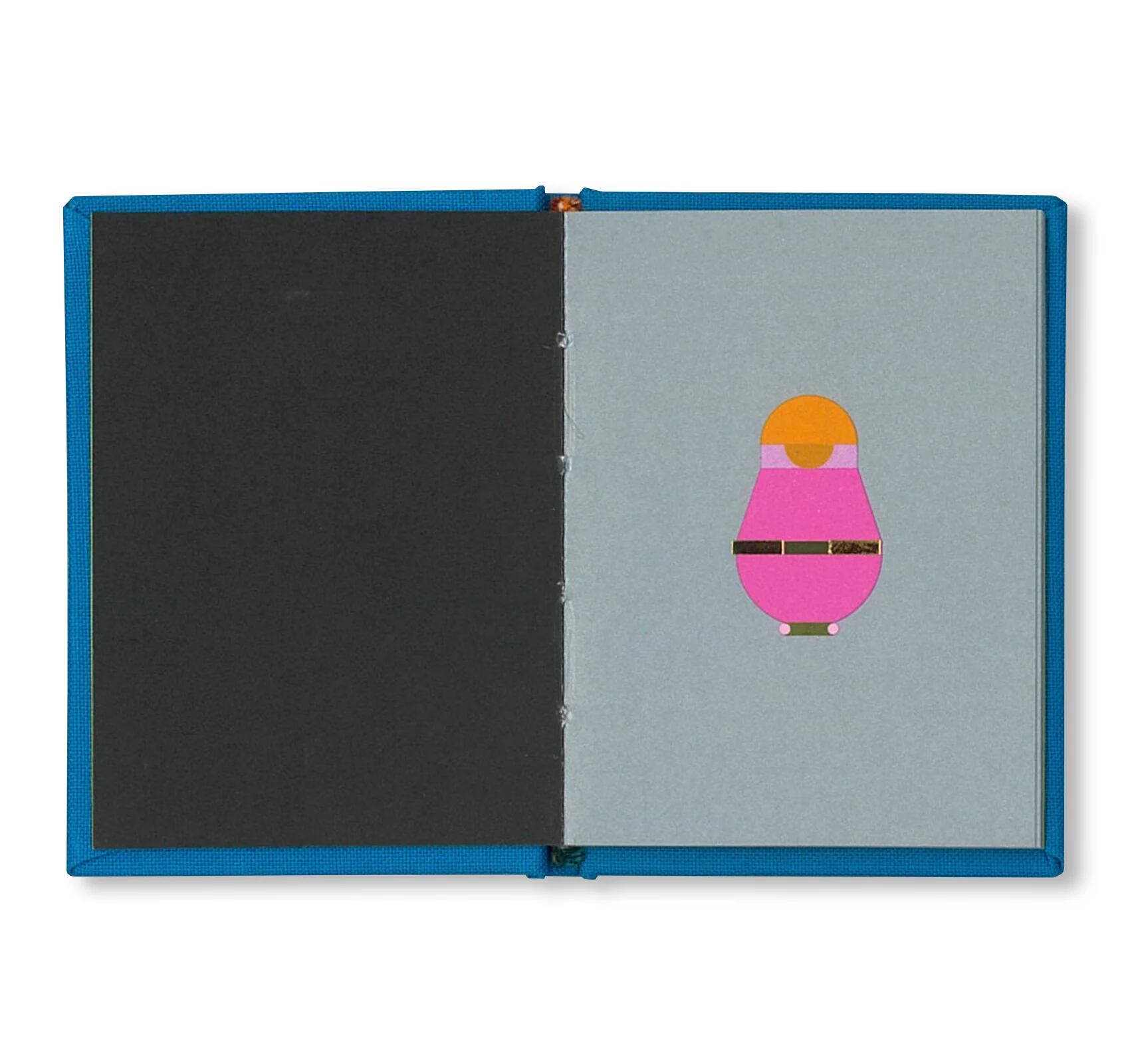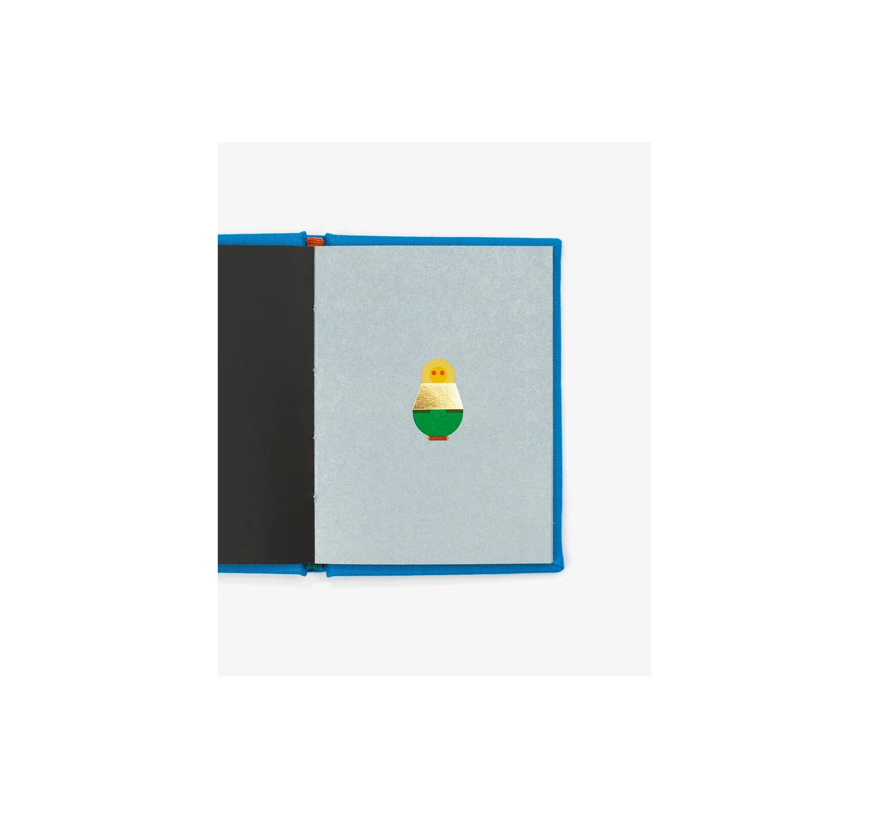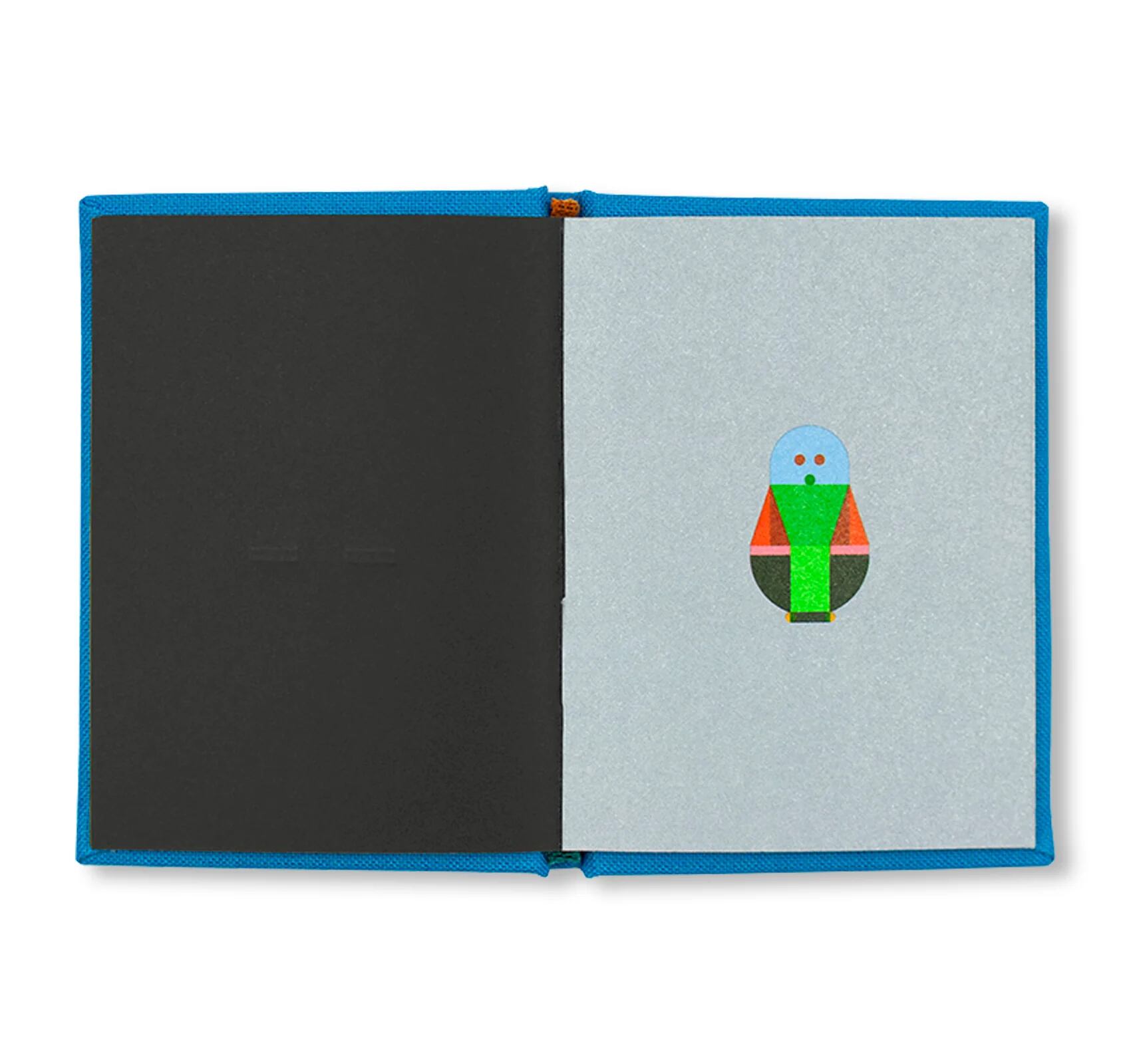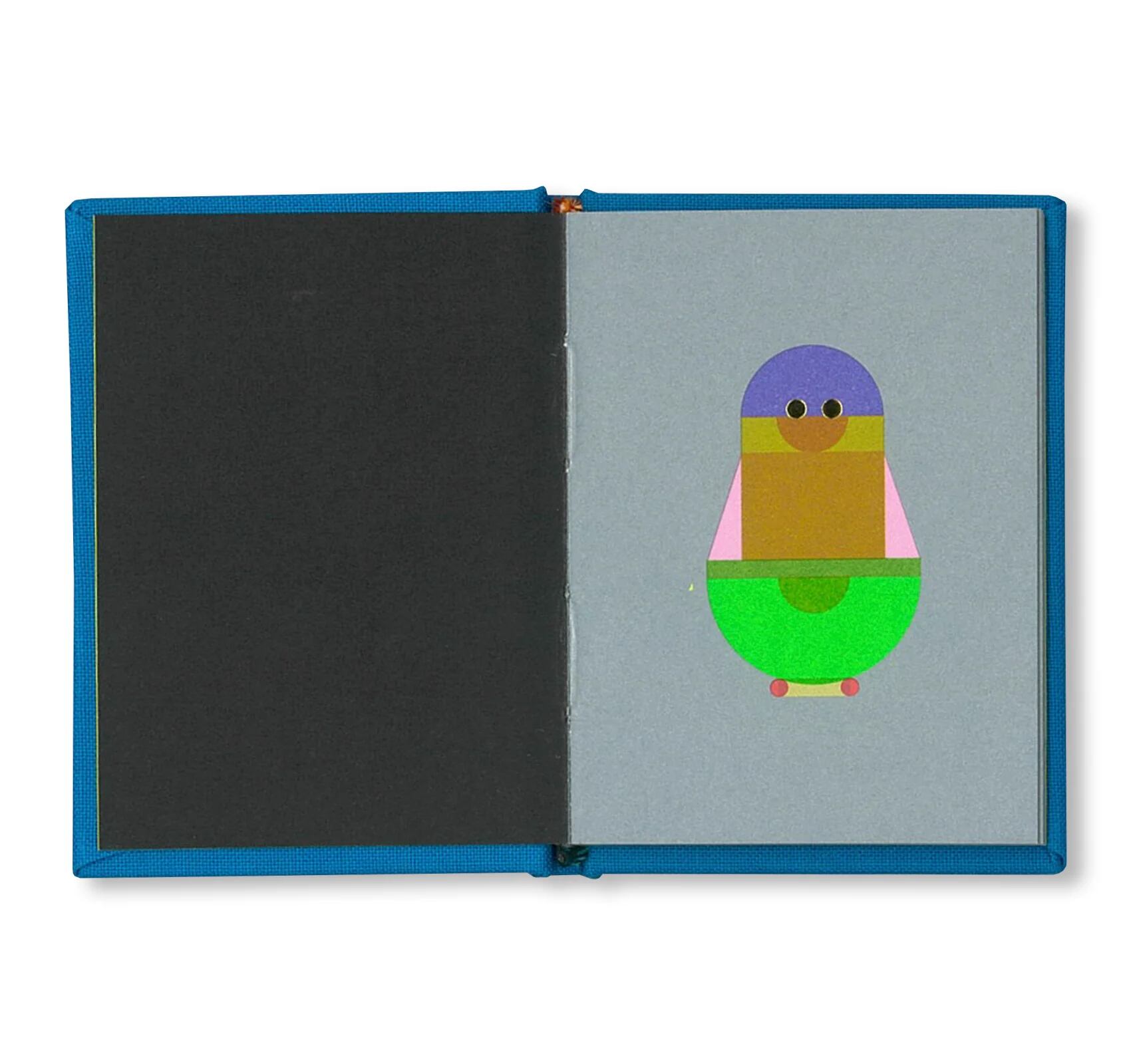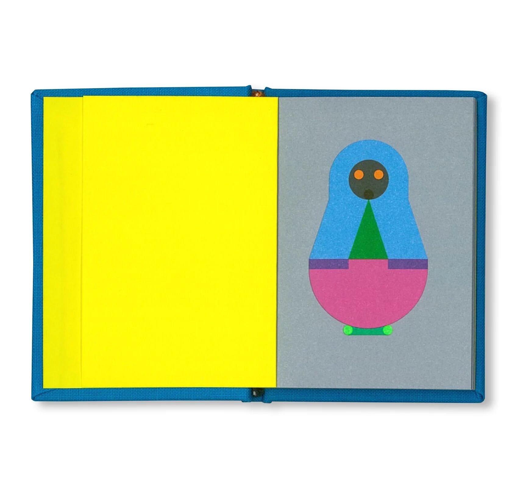 各ページで人形の外観が微妙に変化し、鮮やかな色彩と幾何学的なパターン、モダンなアイコン風のデザインが施されています。