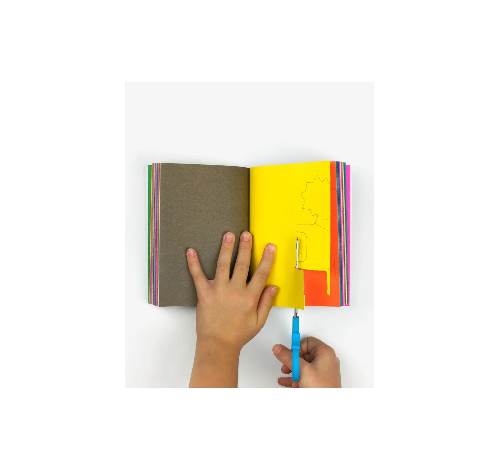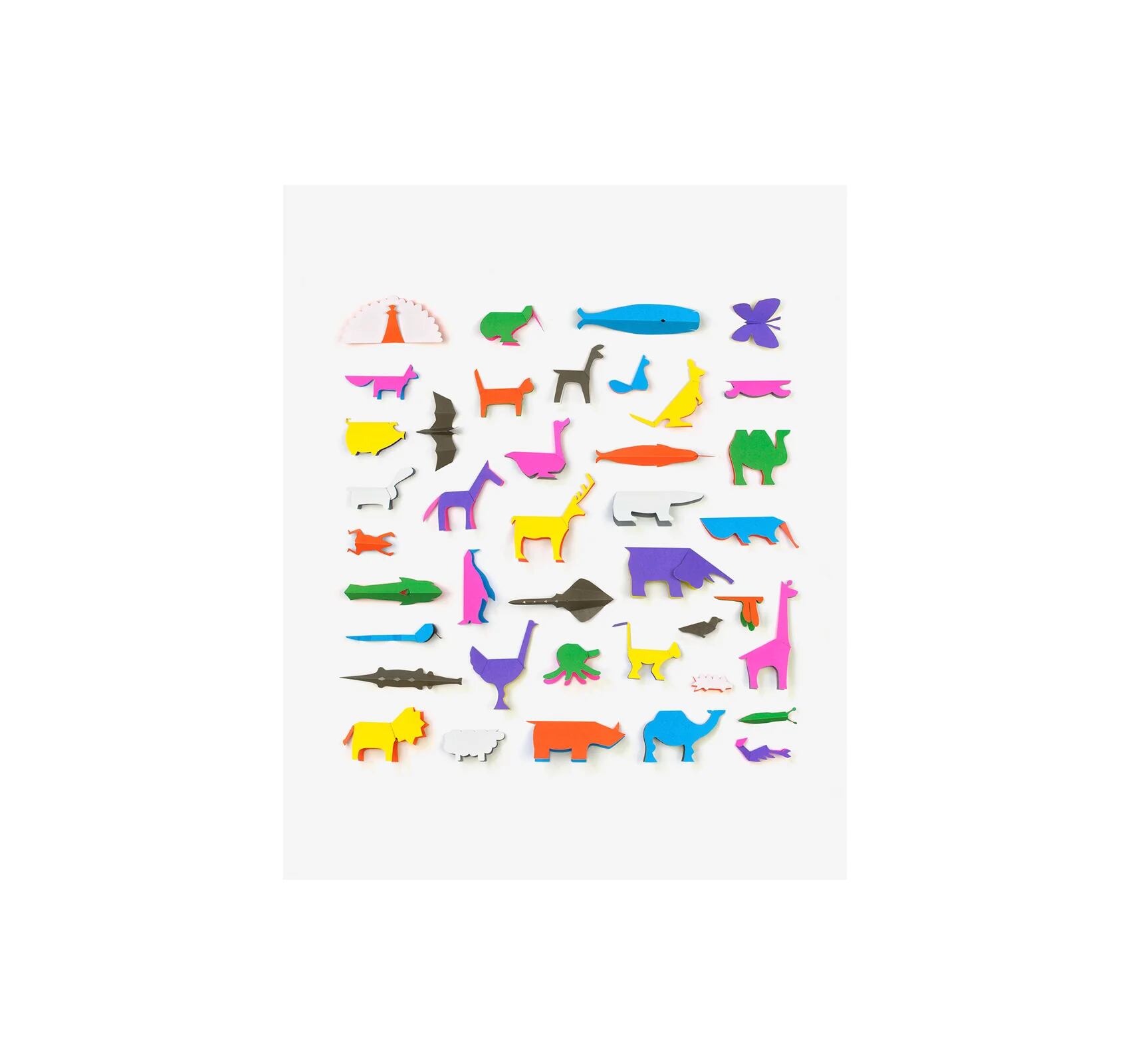 本自体が材料になって、切って折るだけで立体になります。各ページにカラフルにデザインされた動物のシルエットが印刷されていて、ハサミで太い線に沿って切り抜き、1回〜2回だけ折るだけで(とても簡単!)平面的だった紙が自立する立体的な動物ができあがります。