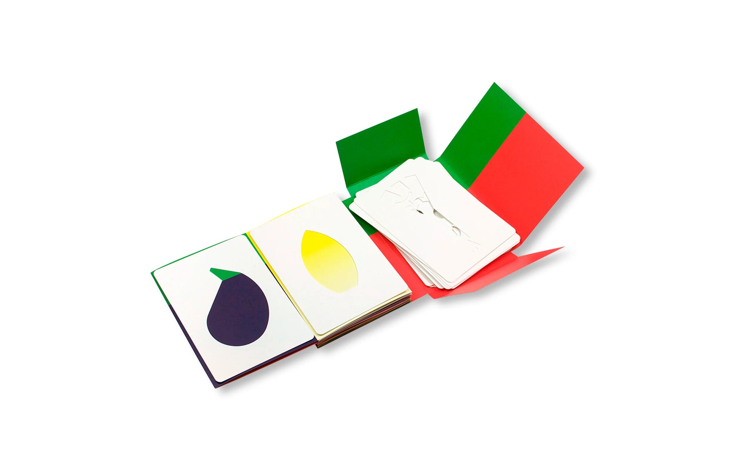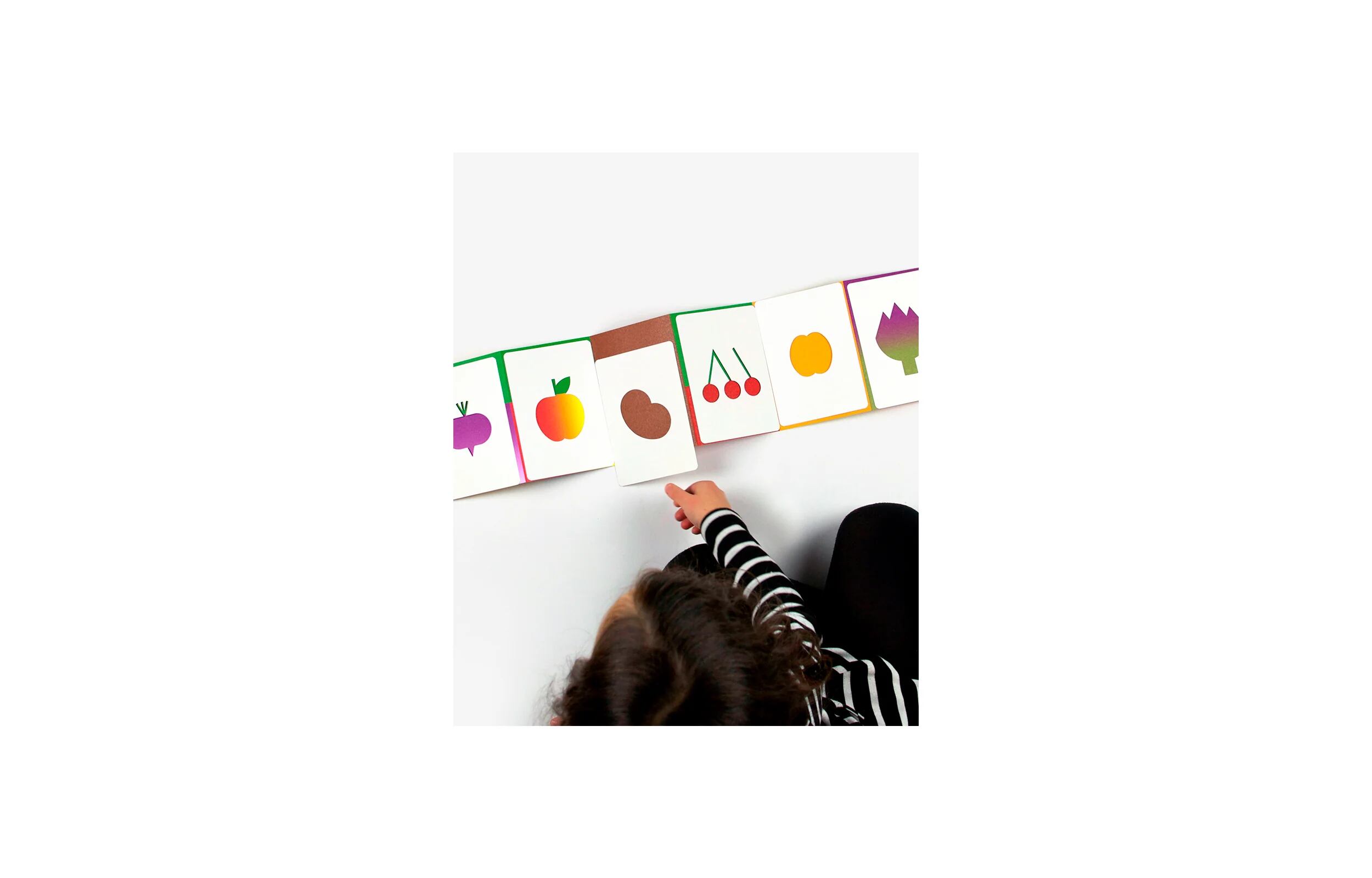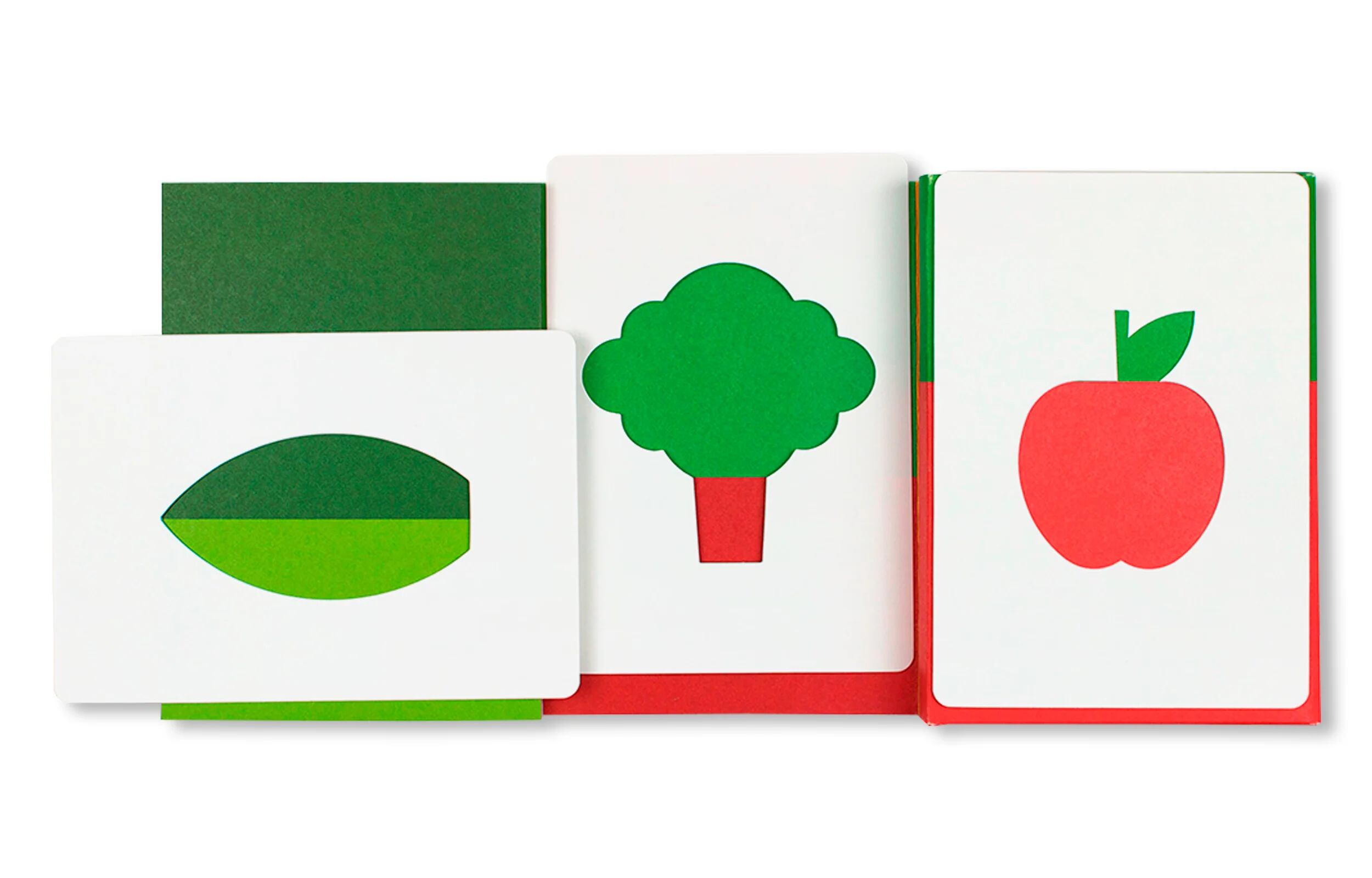 これらのカードは野菜や果物のシルエットが抜かれていて、色付きの背景の上に置くと「実」が現れる仕組みです。