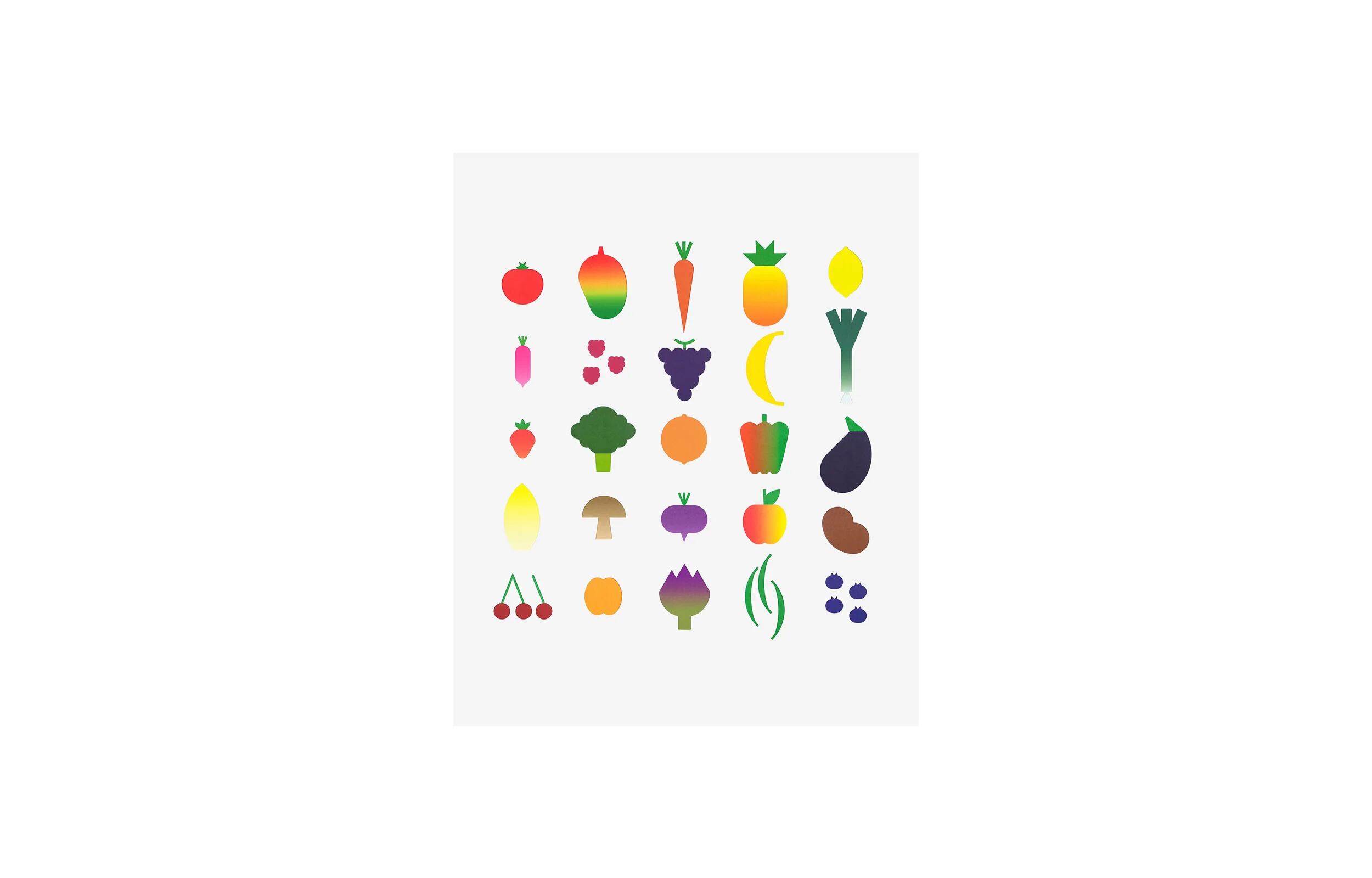 本を広げると、色鮮やかなページ(背景)が何枚も現れます。型抜きされた25種類の果物・野菜のカード(トマト、ナス、チェリー、レモン、バナナ、イチゴ、ブロッコリーなど)が付属しています。