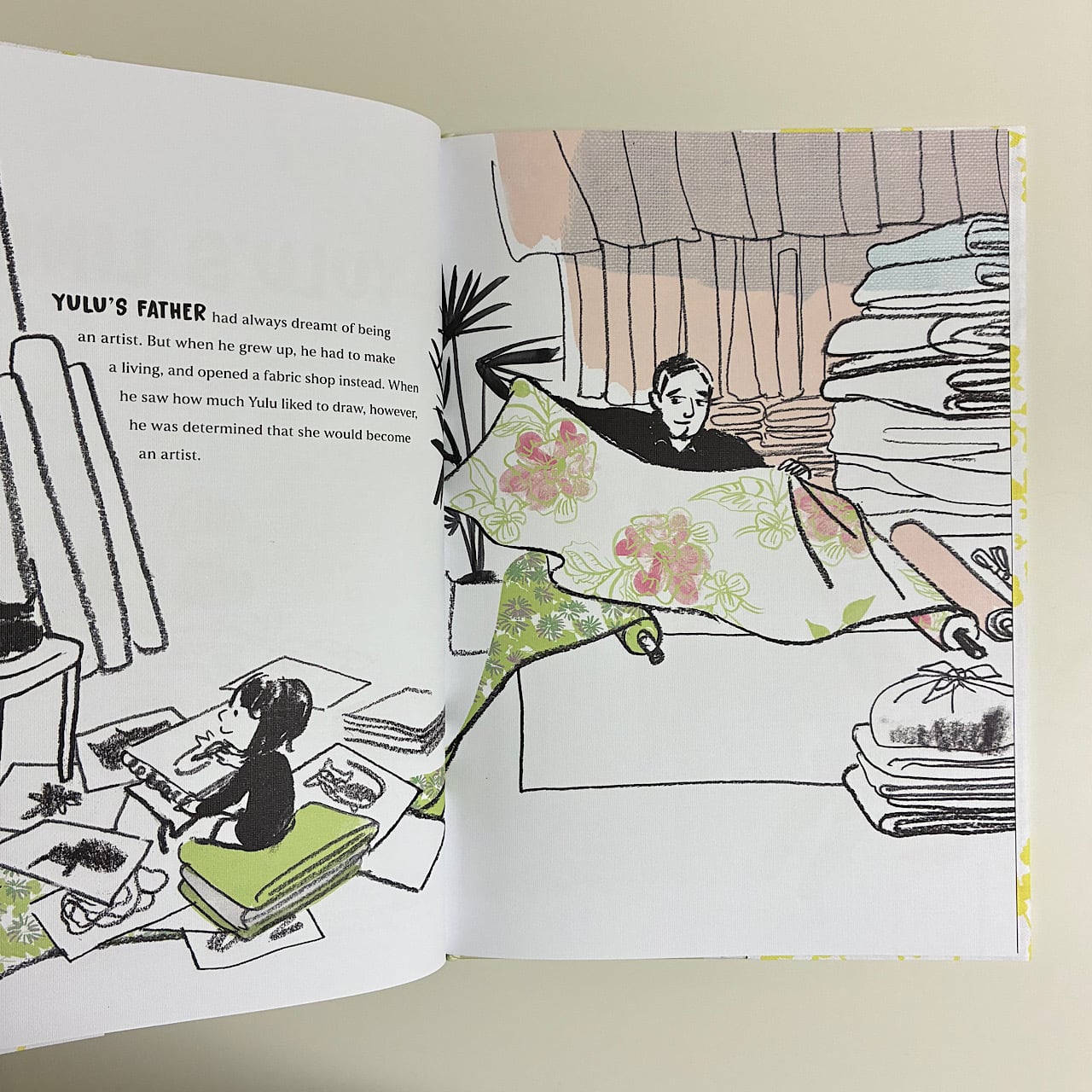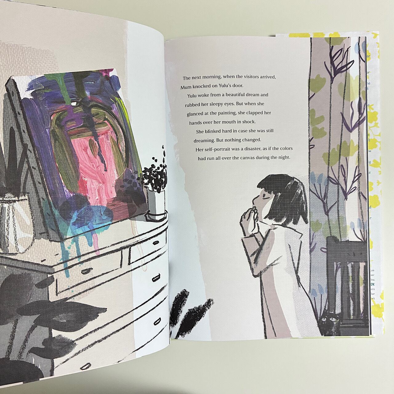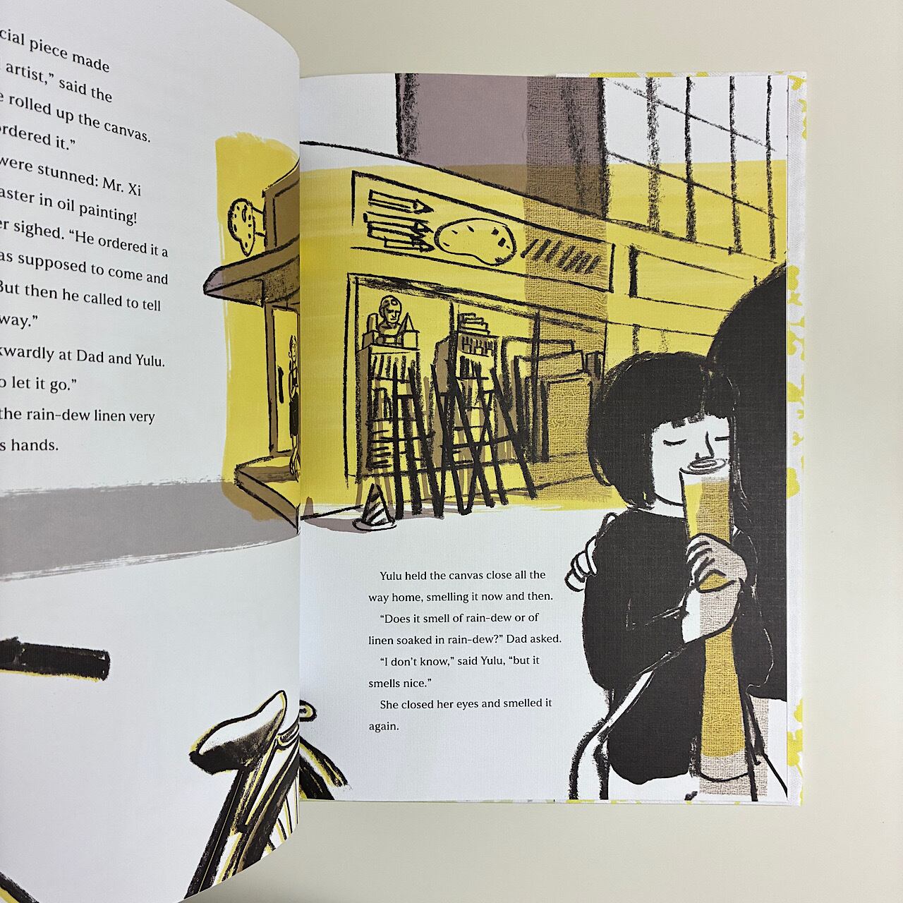 She summons her courage and paints. But the next day, the paint has run and oozed and dripped—the painting is ruined! Yulu picks her brush back up, but day after day, the linen of her canvas itself seems to be rebuffing her attempts. Yulu, undeterred, works on and on.