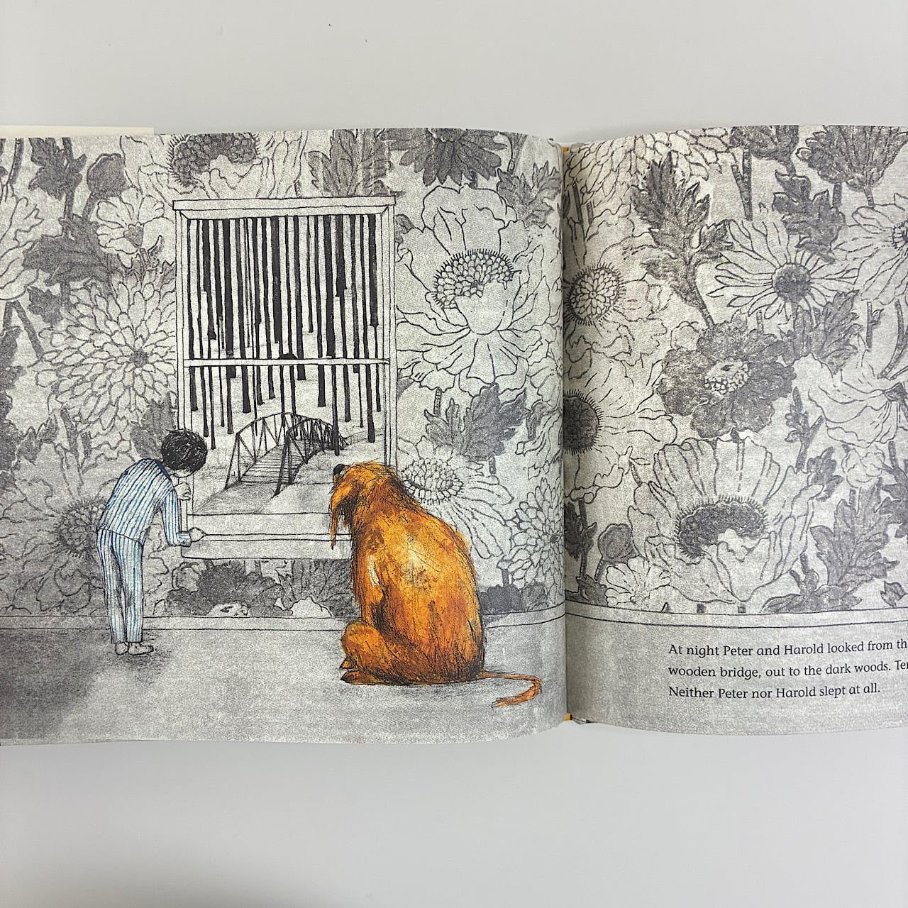 夜になると、ピーターとハロルドは二階の窓から、木製の橋の向こうの暗い森を眺めました。木々の間には恐ろしいものが潜んでいる気がします