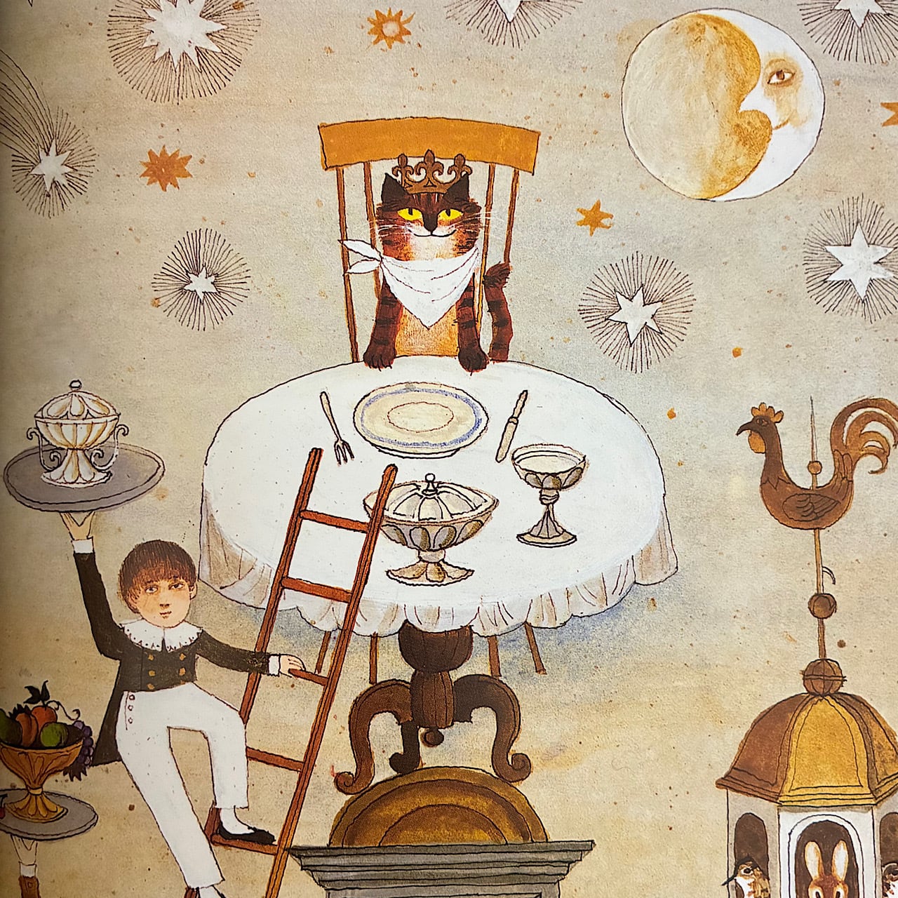 宿屋には、ウサギやネズミ、賢い牛、猫の王様、トラ、マーマレード帽子の男、そしてもちろんウィリアム・ブレイク自身など、不思議な生き物たちが住んでいます。