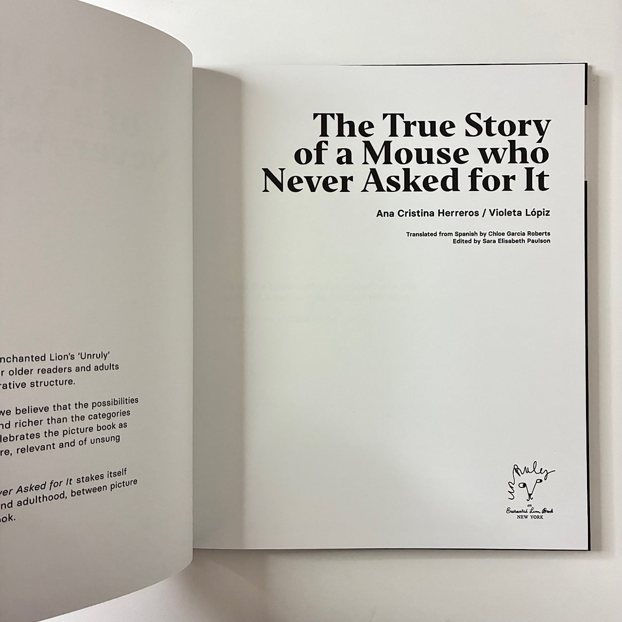The True Story of a Mouse Who Never Asked for It is a visually striking, deeply feminist, contemporary retelling of a Spanish folk tale, rediscovered and brought to new life by author Ana Cristina Herreros and illustrator Violeta Lopiz. In Herreros and Lopiz's version--which sharply diverges from the most mainstream and popularized telling of the story--a mouse is approached by many suitors, rejecting all but one: a cat, whose gentle meow assures her that he won't bring her harm. But one must remember that a kitten always grows up to be a cat...and thusly, will devour the mouse.
