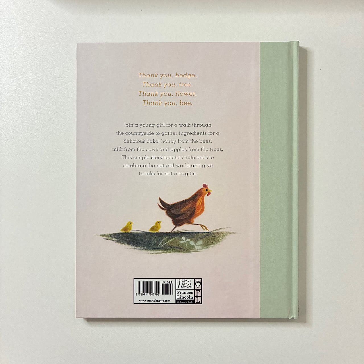 In this simple rhyming story from the author of Held in Love, a child says thank you for the gifts nature provides, from hazelnuts in the hedge to apples from the tree, eggs from the hens to milk from the cow. Eventually, the family has enough ingredients to make something special ... a delicious apple cake!
