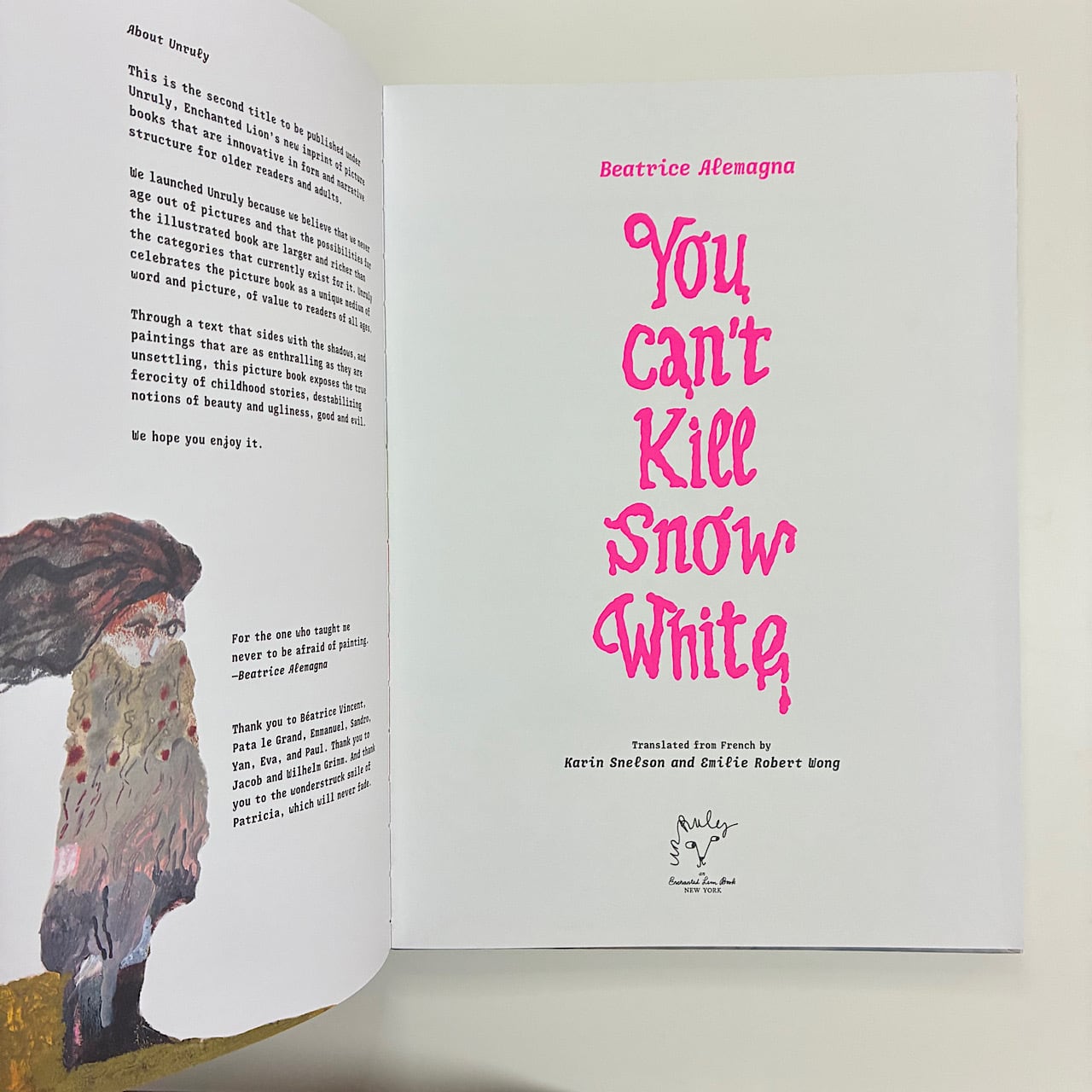 Told through a series of riveting, unsettling images as well as a bold adaptation of the Grimm's original text, this version of Snow White brilliantly puts us all in touch with the messy, shadowed, fraught, and fragile inwardness we each possess. This is the second book to appear under Unruly, an imprint of picture books for older readers, and will include an author's note and a short note to readers about how it continues to build this experimental framework of visually complex, sophisticated picture books for teens and adults.