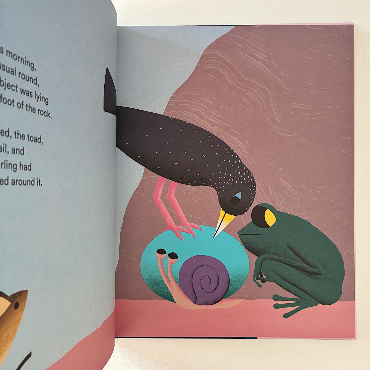 ある朝のこと、大きな岩のふもとには、丸いものがからがっていました。丸いものの周りには、帰るとカタツムリとムクドリが集まっていました。