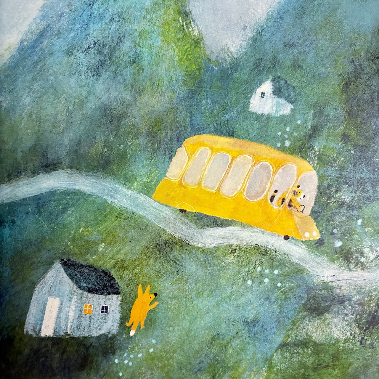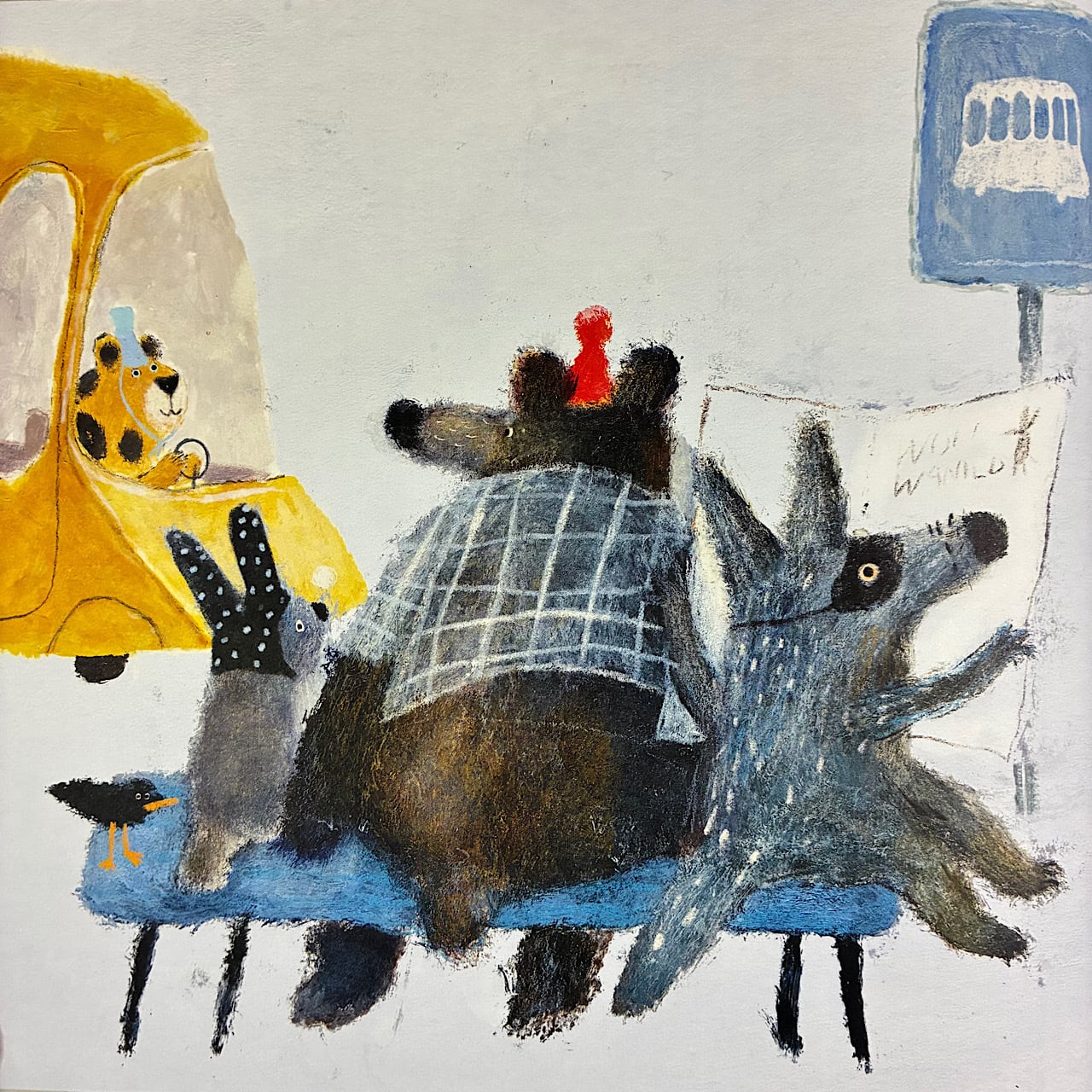 . until the day something amazing and new appears: a little car that speeds off into the distance, leaving clouds of smoke in its wake. Intrigued, the bus’s passengers each get a car of their own, one by one, until the day that Miss Leoparda is the only one left on the bus.